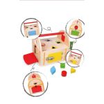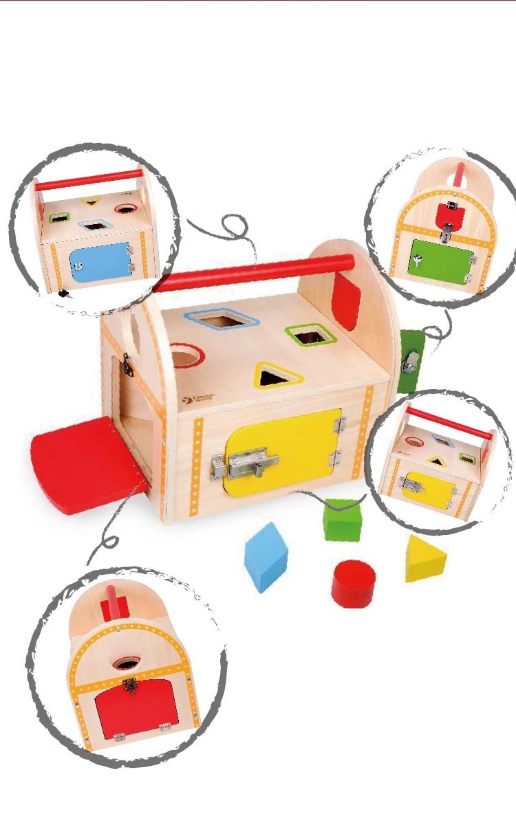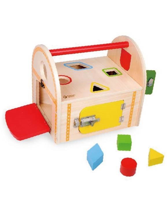 Детска дървена кутия с фигурки и ключалки. Тя може да се използва от децата като сортер, опитвайки се да вкарат всяка една от геометричните фигури през определените за целта дупки. Играта ще стане още по забавна, когато се включат в играта и различните ключалки, с които разполага кутията. Всяка една от страните има вратичка, която е затворена с различна по сложност ключалка. За да извадите фигурите от кутията, първо трябва да разгадаете как се отварят цветните врати?