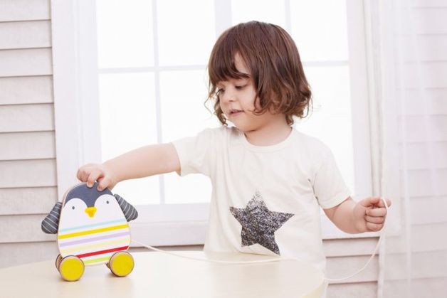 Това забавно дървено пингвинче ще съпътства децата да направят първите си стъпки, дърпайки го с въженцето или като го бутат по пода.