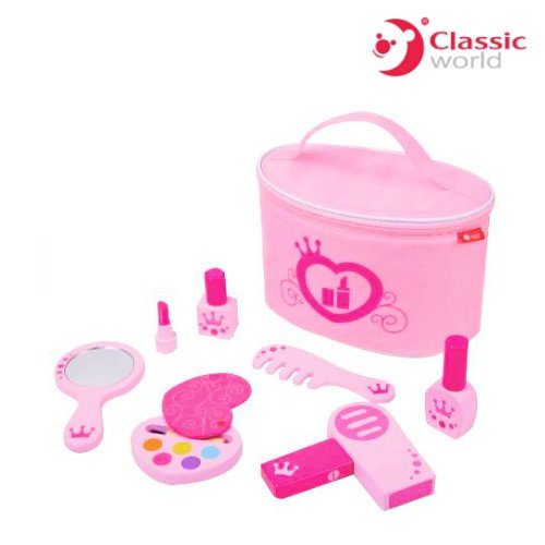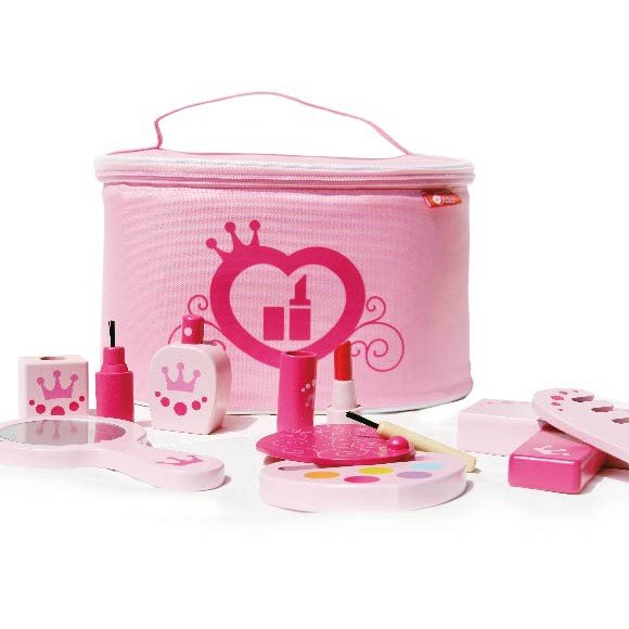 В красиво изработена чантичка с цип вашата малка госпожица ще открие различни принадлежности за гримирате – лак за нокти, парфюм, гребенче, огледало, сенки за очи… Всички аксесоари са изработени от дърво, като повърхностите им са прилежно полирани и оцветени с боя на водна основа.