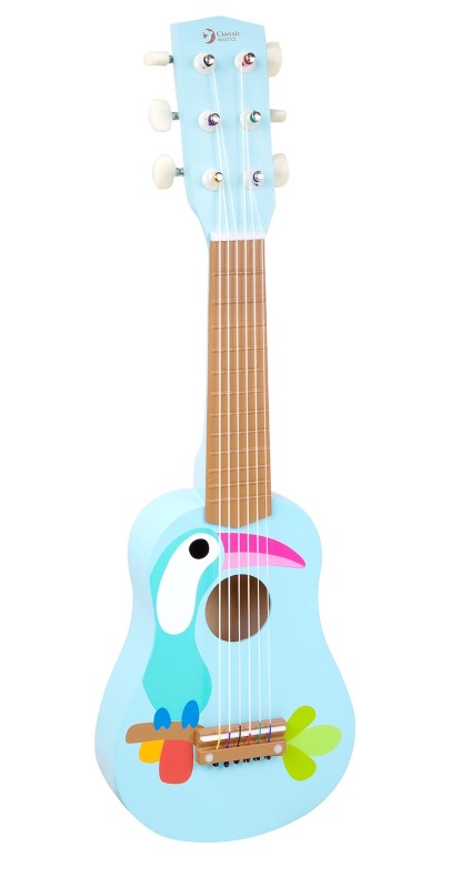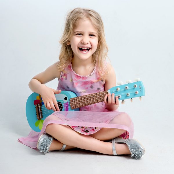 Детска китара изработена от дърво с красива украса на корпуса и 6 струни, които издават чист мелодичен звук. Удобна е за свирене от малките бъдещи звезди.