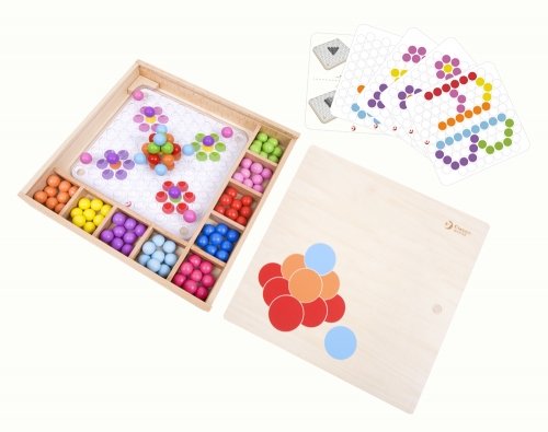 Детска мозайка с цветни топчета – това не е просто красива играчка, тя е полезна за развитието на децата. Стимулира въображението, творческото им мислене, логическото мислене, подобрява фините двигателни умения. Комплектът освен цветни топчета включва и работни карти, които лесно могат да се поставят под прозрачната основа, с помощта на които детето ви ще прави различни фигури, ще пише букви и цифри или само ще твори различни карикатури.