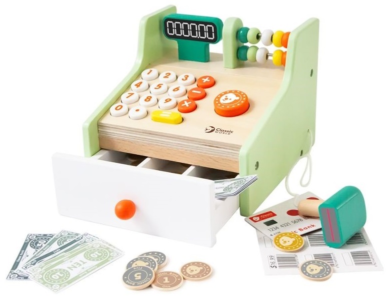Касовият апарат с банкноти и монети от Classic World е страхотна дървена играчка, която ще ви позволи да изиграете много сцени, които може да се разиграят в магазина.