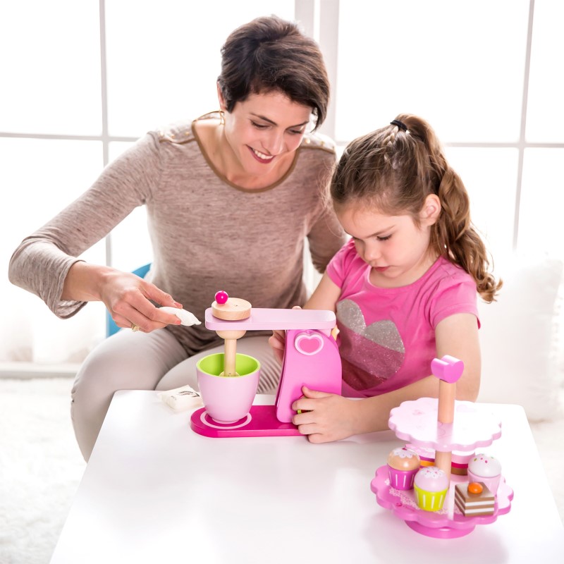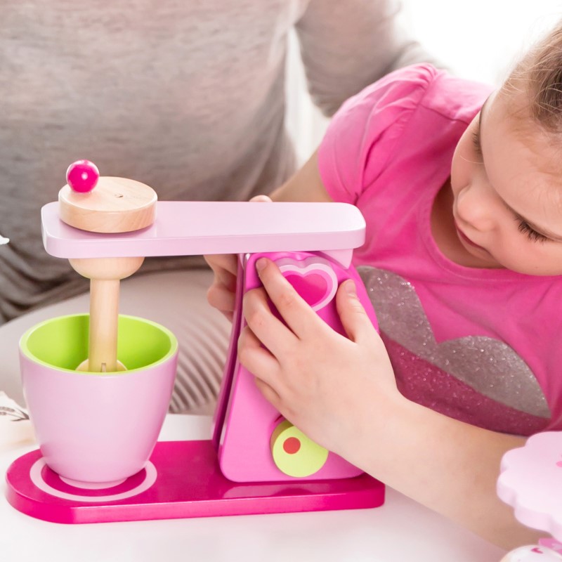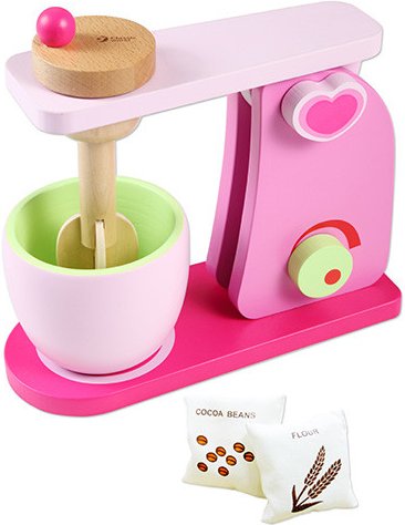 Красив и удобен дървен миксер с въртяща се основа, който ще се превърне в любимия кухненски помощник на всяка малка домакиня. С него всяко дете ще се радва да приготви вкусни сладкиши на своите кукли. Играта с него стимулира въображението, практикува фините двигателни умения и развива уменията за общуване на децата. Подходящ е за игра и в детски градини.