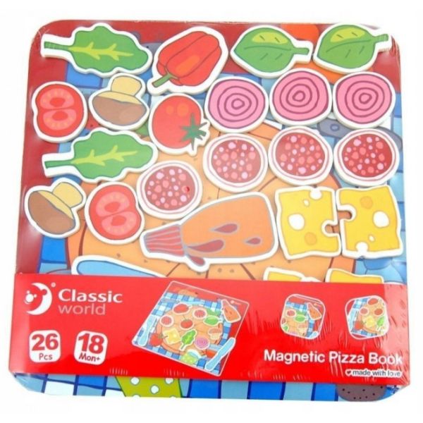 Магнитна игра, която ще позволи на детето ви да се почувства като истински готвач. Различните съставки – зеленчуци, колбаси и подправки ще му помогнат да създаде най – вкусната рецепта. Играта е изработена от екологично чист и безопасен материал, като всички елементи са здраво фиксирани върху основата с магнити. Преструвайки се на пицар, детето ви тренира фините двигателни умения, въображението си и развива своята лексика. Комплектът съдържа 33 елемента – 1 игрално поле за основа на пицата и множество храни за декорация.