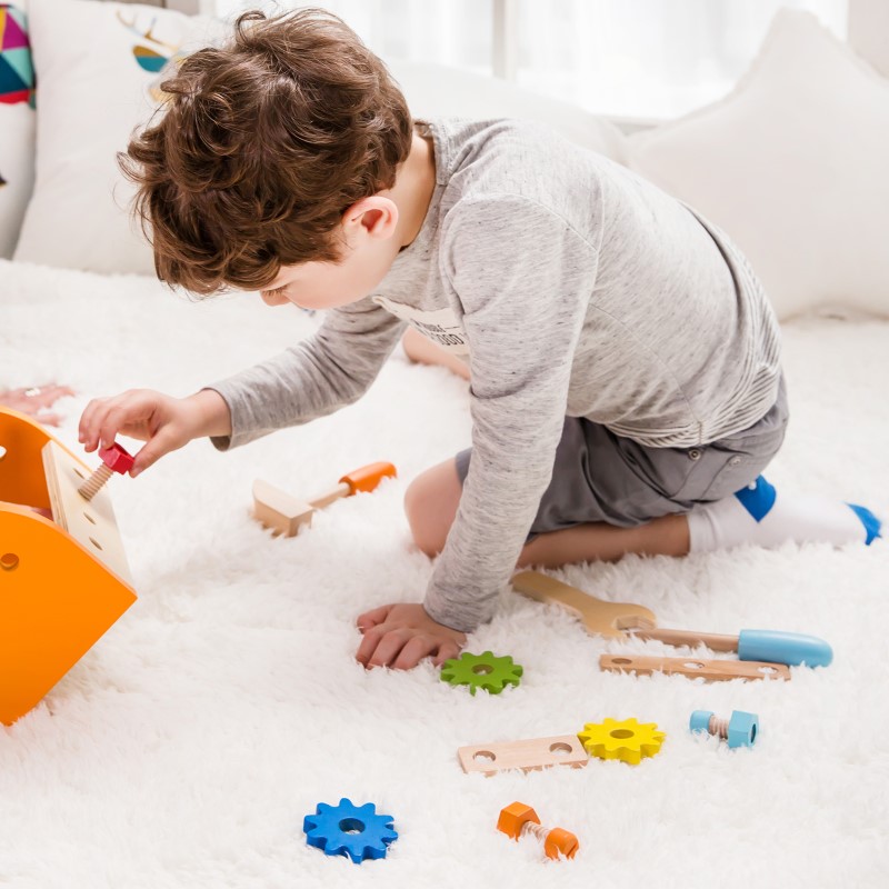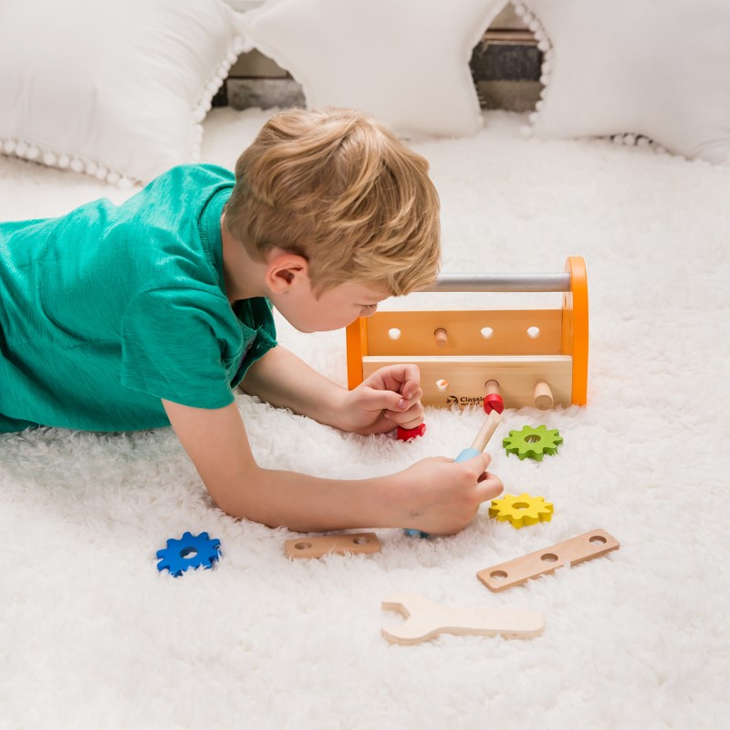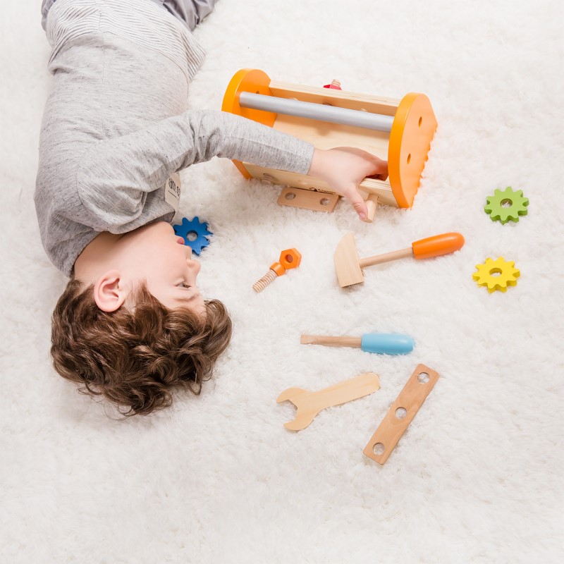 Детски дърводелски комплект включващ различни инструменти: чук, отвертка, гаечен ключ, планки, болтове, види, пирони, зъбни колела, всичко това е прилежно прибрано в удобна кутия с дръжка за носене. Не се притеснявайте и оставете всичко в ръцете на Вашия малък бъдещ майстор, той ще се погрижи за всичко. С помощта на тази играчка, децата ще изучат инструментите и това, как да ги използват.