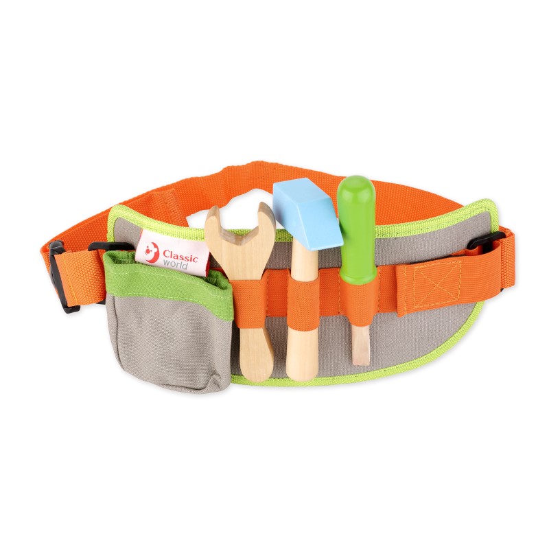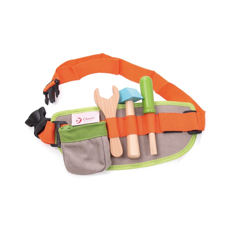 Детски класически колан, съдържащ разнообразни дървени инструменти: чук, гаечен чук, винтоверт, гайки, болтове и други. Инструментите лесно се поставят и вадят от колана. Играта с този комплект ще помогне на децата да се научат да ги идентифицират и да получат известни познания за тяхното използване.