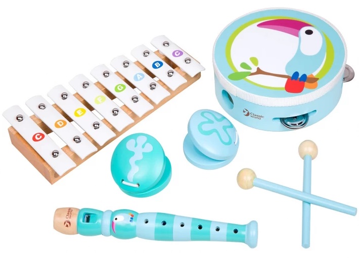 Свиренето на инструменти има положителен ефект върху развитието на малките деца чрез общуване с музика. Комплектът ще зарадва всеки малък фен на музиката и ще направи домашните концерти безкрайни.