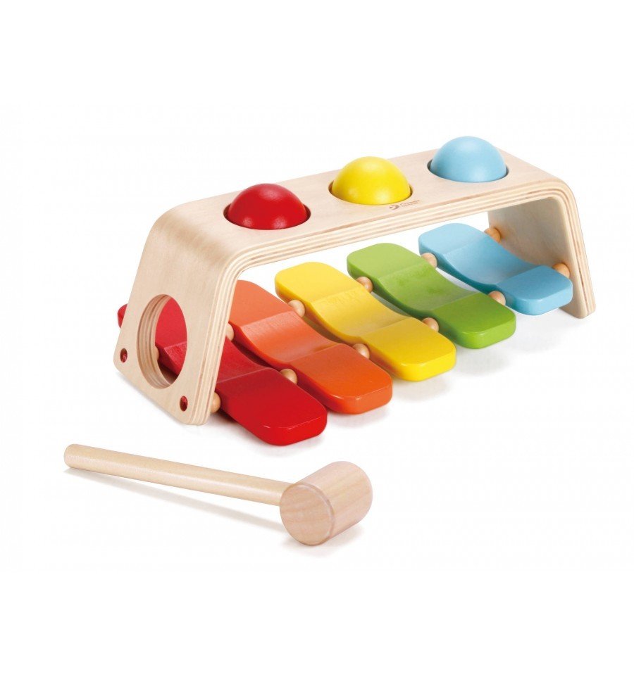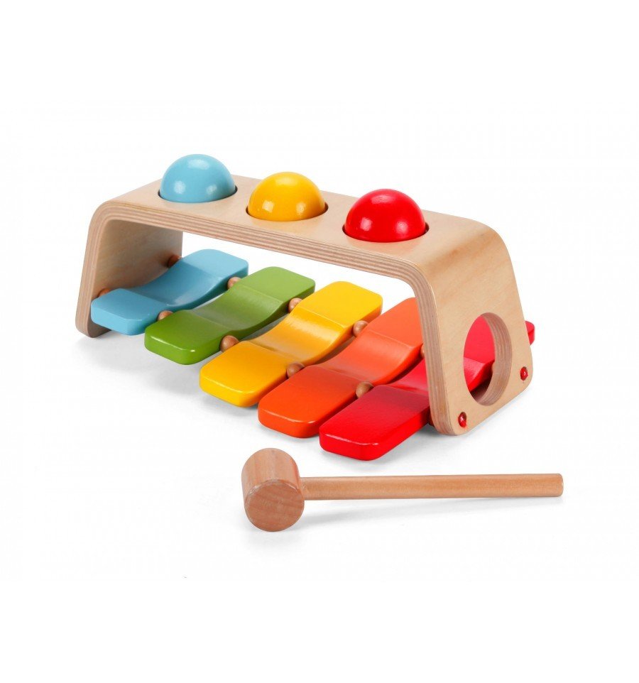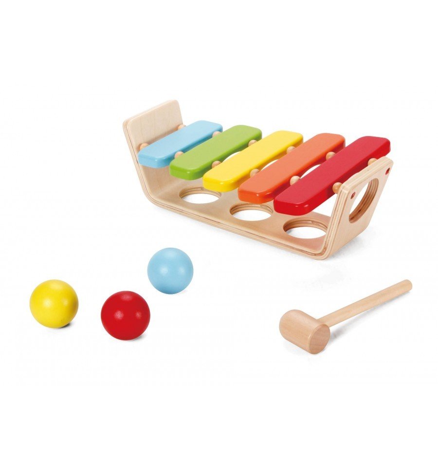 Детска дървена играчка, с която вашето дете може да свири по два много забавни начина: с помощта на чукчето, детенцето удря по топката и ксилофона издава звуци или да търкулва топката по клавишите през специално направеният за това отвор и след това се наслаждава на звуците.