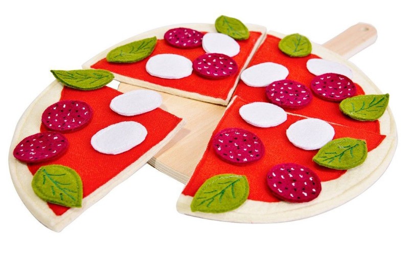 Детски дървен кухненски комплект за запалени кулинари. Комплекта се състои от дървена дъска за рязане и текстилни продукти за приготвяне на пицата. Тази играчка е подходяща за деца над 3 години, защото спомага за развитието на тяхната креативност и усещане за форма и цвят.