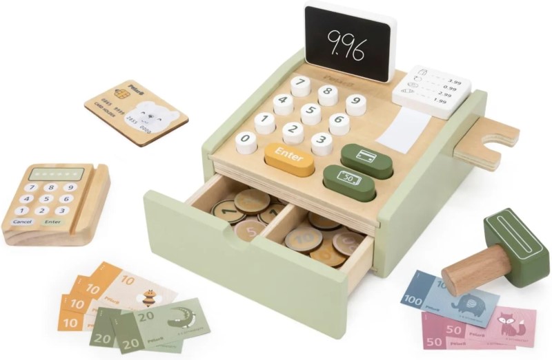 Детски дървен касов апарата с баркод четец, който ще въведе вашето дете във вълнуващо забавление като влезне в ролята на касиер или продавач в супермаркет, магазин за дрехи или цветарски магазин. Играта с него развива въображението и фантазията, помага на децата да се научат да броят, как да използвате парите и подобрява социалните умения. Оборудването ще помогне на вашето дете да развие логическо мислене и ръчни умения.