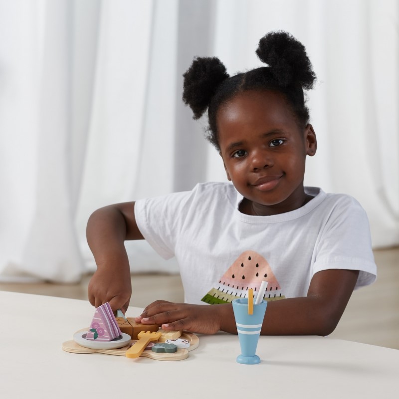 Детски комплект за обяд включващ дървена пържола, пържени картофки, зеленчуци, десерт, напитка, нож и вилица и прекрасна поставка за сервиране.