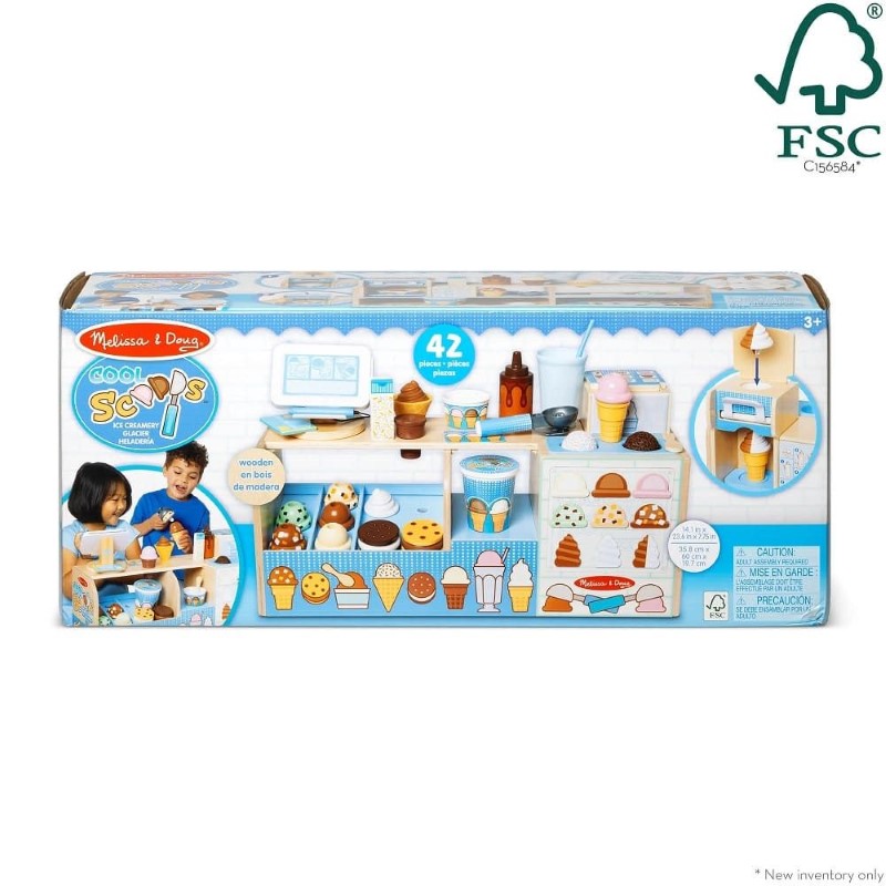 Дървеният магазин за сладолед от Melissa and Doug предоставя пълноценно изживяване за ролеви игри, което позволява на децата да поръчват, създават и сервират сладоледени изкушения. Комплектът включва 42 части, включително дозатор за мек сладолед, магнитна дъска за поръчки и плащания, меню, зона за показване на продуктите и обширно място за съхранение на аксесоарите. Играчката предлага реалистично преживяване за малки „сладоледаджии“, като същевременно развива фината моторика и когнитивните умения.