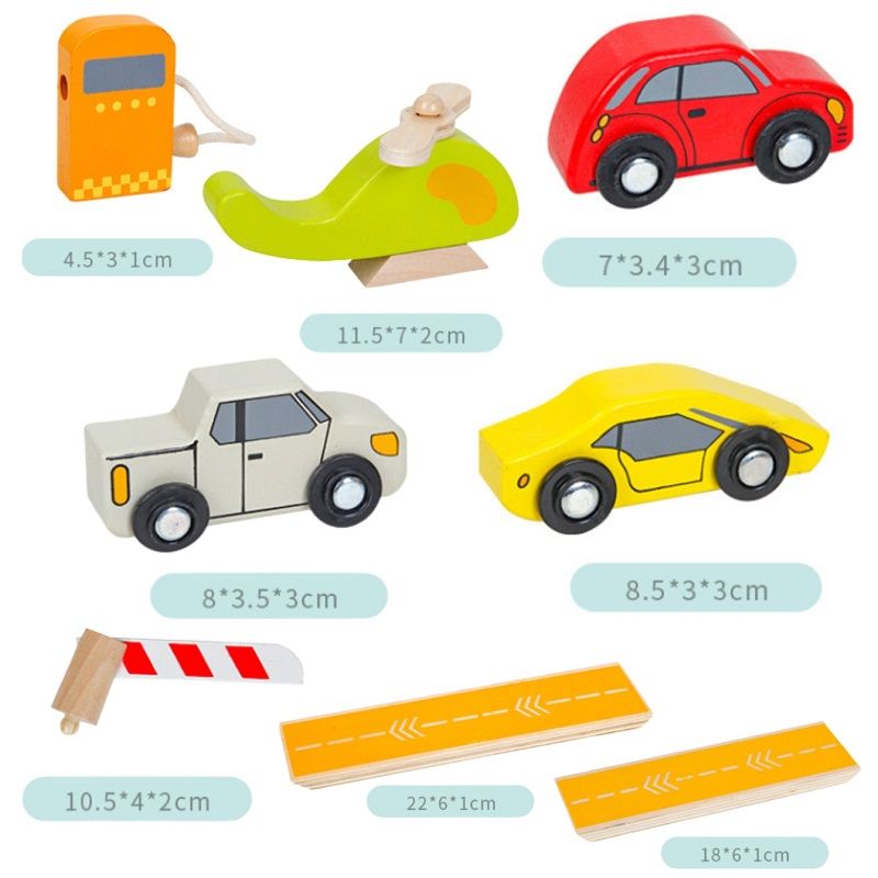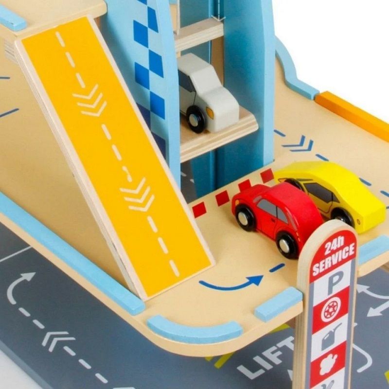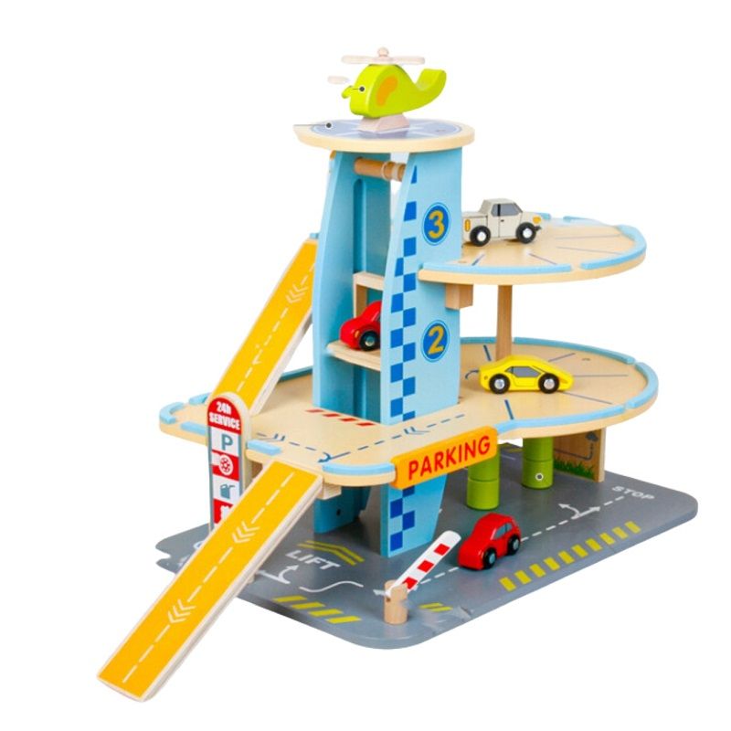 Детски дървен паркинг на 3 нива с площадка за кацане на хеликоптер, с включени колички и пътни знаци.