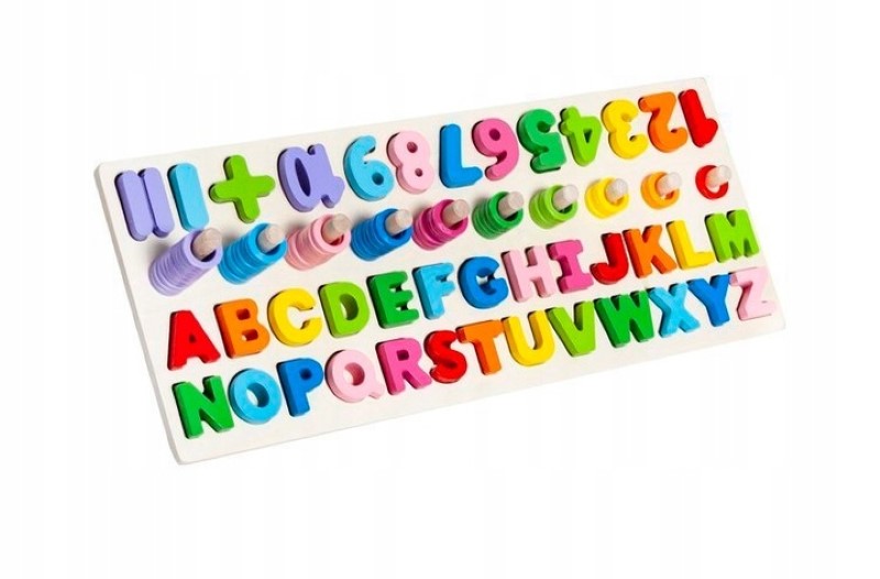 Детски образователен пъзел включващ дървена дъска с цялата азбука и цифри, които имат своите двойници под формата на пръчици със съответния брой пръстени, които могат да се свалят и коригират. Подредени са в правилния ред от първата до последната буква на азбуката и от най-малкото до най-голямото число.