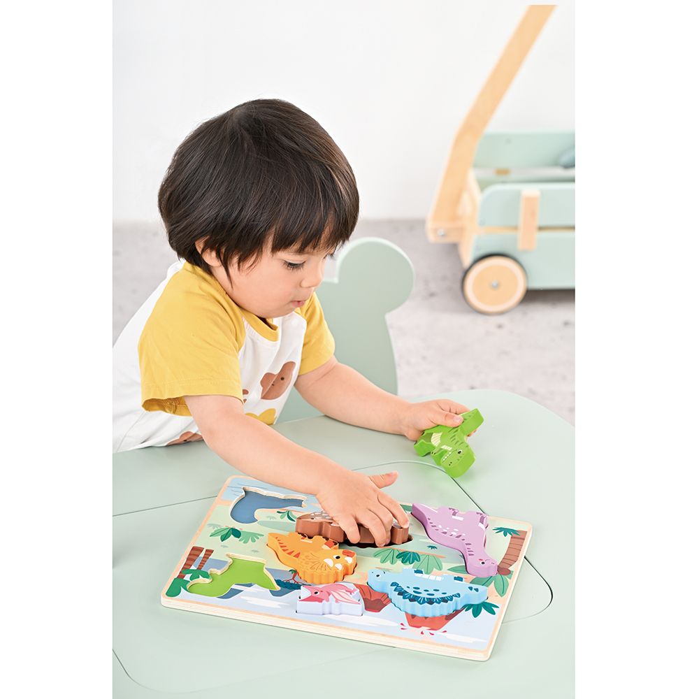 Дървен пъзел с фигури на динозаври, които детето трябва да подреди на подходящите места.