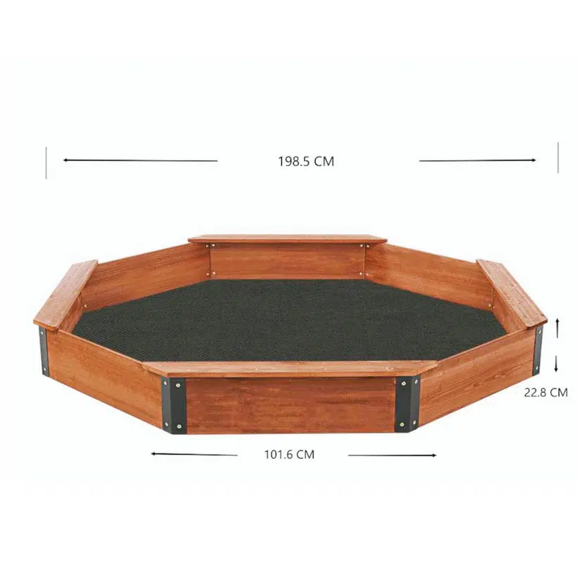 Пясъчникът е с осмоъгълна форма с 4 седалки и е изработен от здрава дървена конструкция и събира 350-450 кг пясък. В него спокойно могат да играят 6-8 деца, което го прави чудесен за игри и в детски ясли и детски градини.
