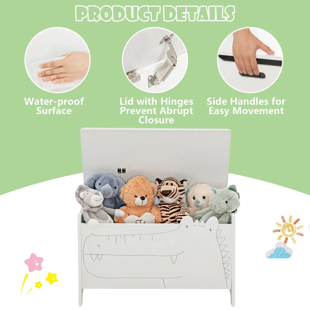 Детски дървен скрин с предпазната панта, която може да фиксира капака под всякакъв ъгъл, за да предотврати внезапно затваряне на капака. Този скрин е чудесен избор за съхраняване на играчки, книжки, дрешки и други предмети и е страхотно допълнение за всяка детска стая, хол, детска гради и парти центрове.