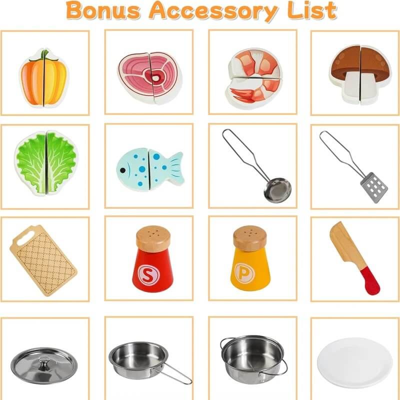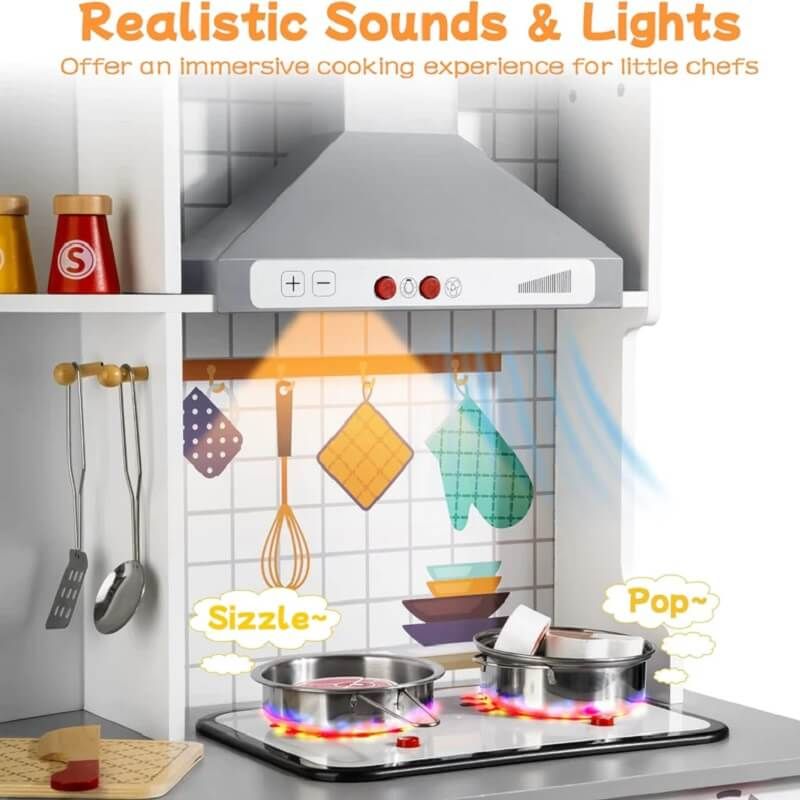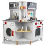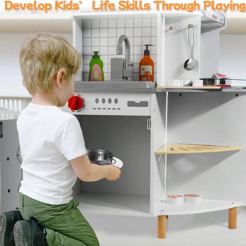 Всички вратички на кухнята се отварят, копчетата се въртят, което я прави реалистична и функционална. Страхотен начин за насърчаване на интерактивни и въображаеми ролеви игри, които ще вдъхновят креативността, часове забавление, усмивки и спокойствие за родителите. Този комплект е издръжлив, подходящ и безопасен за деца. Кухнята е с дизайн, който позволява тя да бъде позиционирана на различни места, за игра в къщи, или в детската градина. Всеки детайл е фино полиран, за да бъде безопасен за игра.