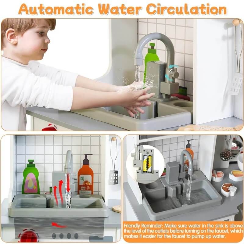 Включва функциониращ воден кран, който ще бъде истинска атракция за най-малките деца. Когато мивката е пълна с вода и кранът се завърти, водата ще тече. Това ще вдъхнови малкото дете да се научи да поддържа своята кухня чиста и подредена.