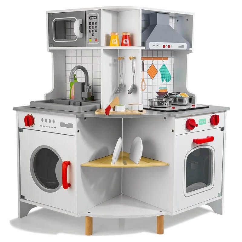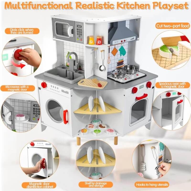 Детската дървена ъглова кухня с множество аксесоари, функции и красив реалистичен дизайн.