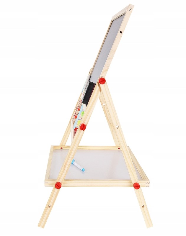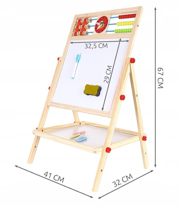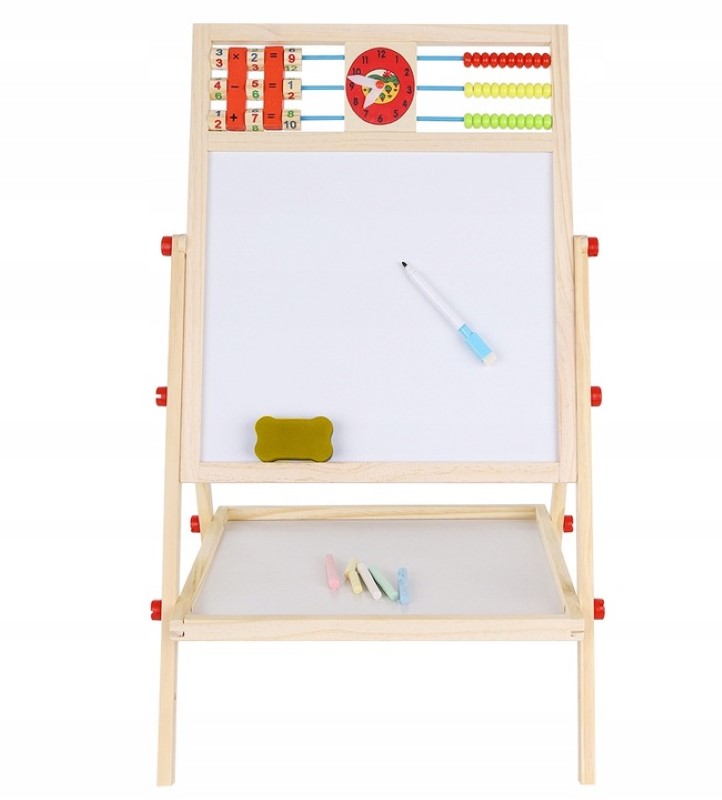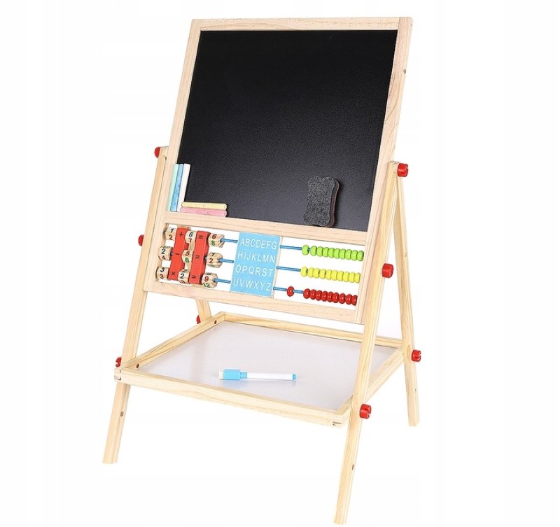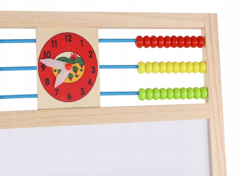 Детска двустранна дъска, с която децата ще могат да рисуват и пишат с тебешир и маркери, ще се научат да броят и смятат с помощта на сметалото, ще се запознаят с основите на математиката и разпознаването на часовете благодарение на часовник с движещи се стрелки. Освен това азбуката на дъската подпомага изучаването на букви и създаване на първите думи, съчетавайки забавление с образование.