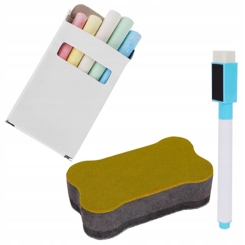- Тебешири, маркер и гъба – комплектът съдържа всичко необходимо, за да започнете да играете веднага след разопаковането, така че децата да могат да се забавляват с творческо забавление без нужда от допълнителни покупки