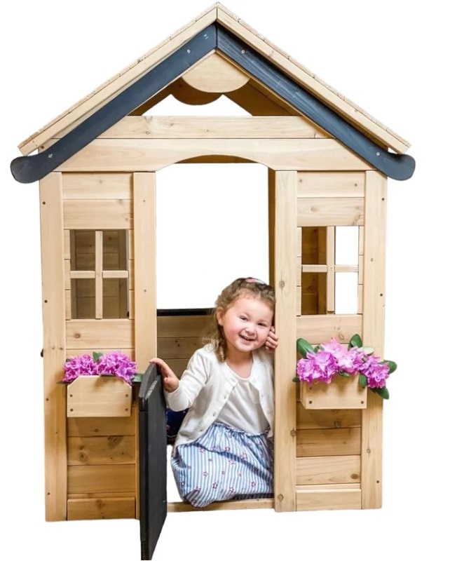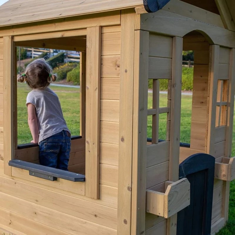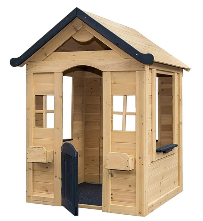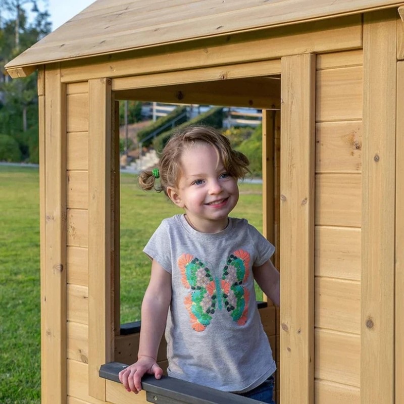 Дървената къща е просторна и разполага с прозорци, врата и таван с височина 140 см. Под широките предни прозорци има поставки, в които можете да поставите и цветя. Игрите навън и на чист въздух са безценни, така че тази дървена къщичка ще им предостави тази възможност да тичат на воля около нея, да си играят или четат книжки вътре, а защо не и да си подремнат, когато им се доспи.