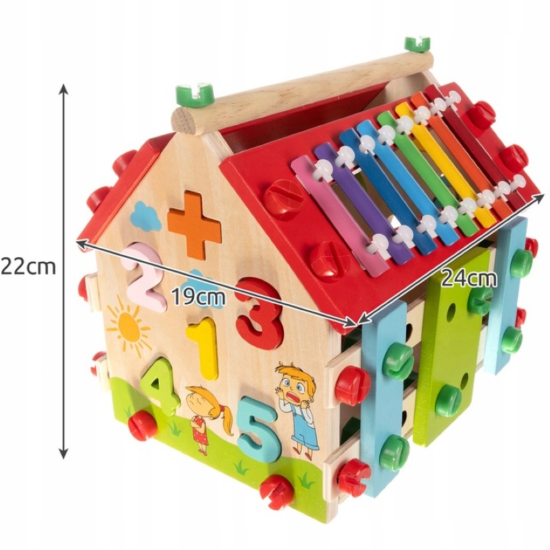 Тази дървена къща е развиваща се играчка, която всяко дете ще хареса. Самостоятелното сглобяване на дървена къща е не само дълго време на забавление, но и обучение, което със сигурност ще се отплати в бъдеще. Образователната къщичка е цветна – живите цветове стимулират въображението и креативността на децата. Манипулирането на движещи се елементи помага за упражняването на малките пръсти, ръчните умения и координацията око-ръка.