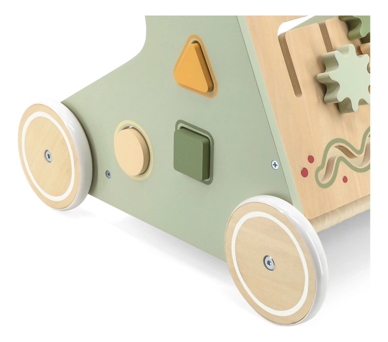 С нея децата могат да се разхождат, да играят и да учат! Тази дървена количка за активност предлага различни дейности, които подпомагат развитието на двигателните умения на вашето дете!