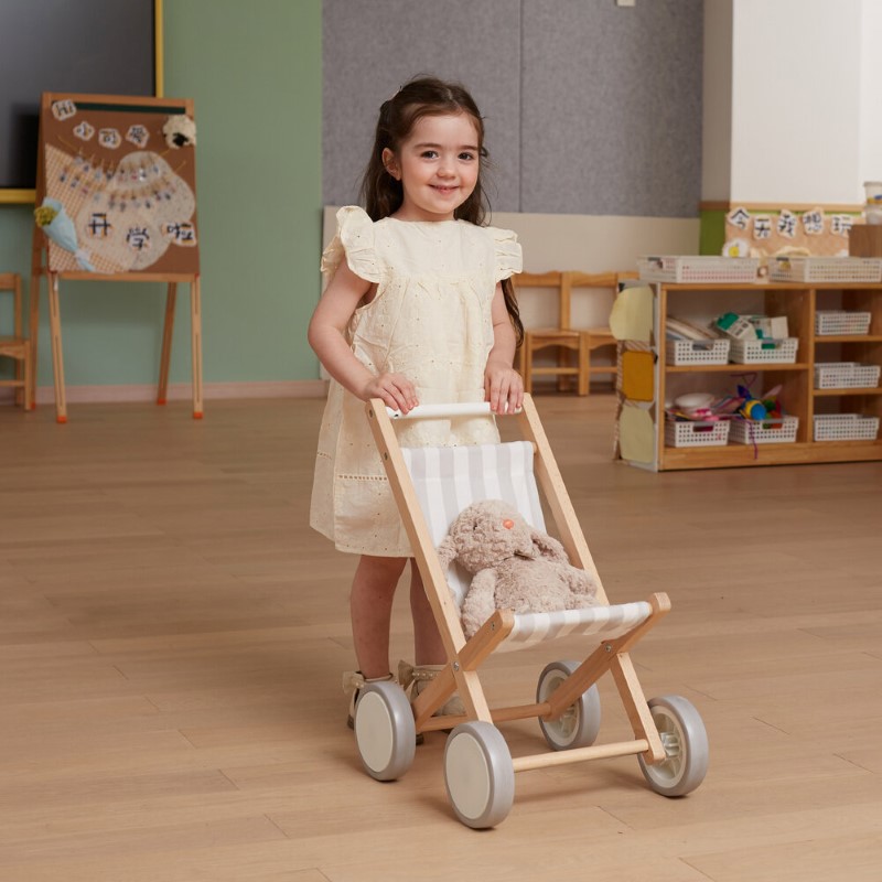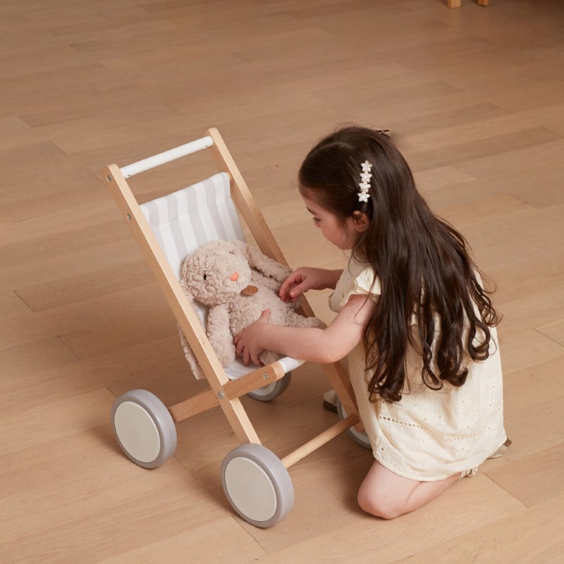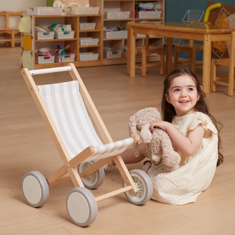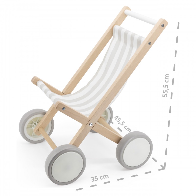 Количката е със солидна дървена букова рамка и здрава текстилна материя на райета. Колелата на количката са гумирани за допълнителна защита, както и за стабилно и уверено ходене от по-малки дечица. Подходяща е за кукли с височина до 38 см.