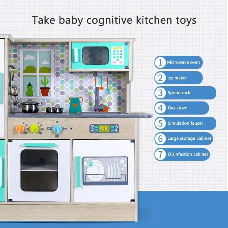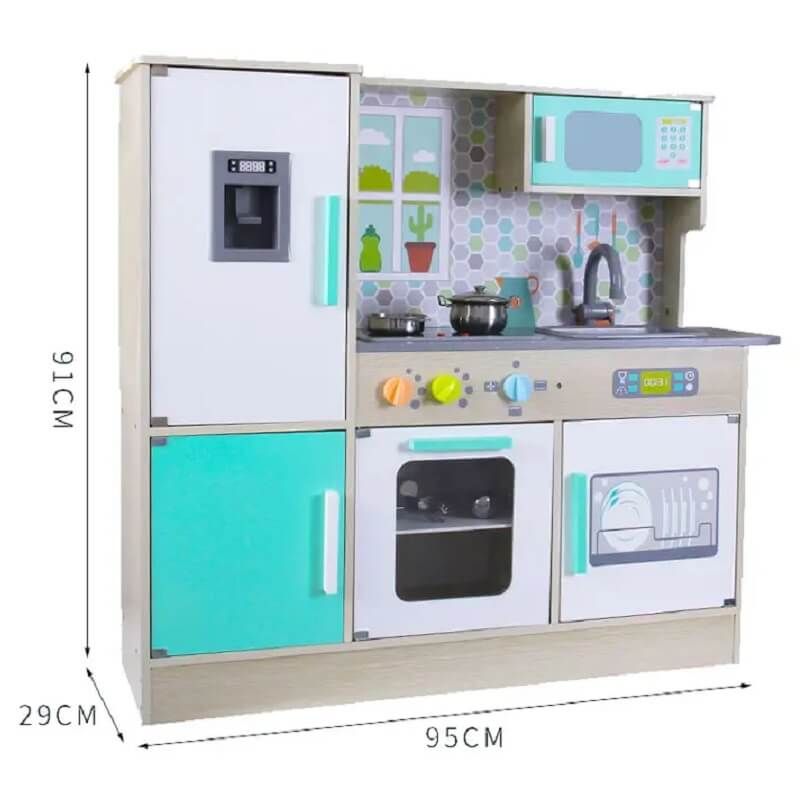 Този кухненски комплект включва пълен комплект аксесоари – панел с котлони, имитация на печка, мивка, хладилник, съдомиялна и микровълнова фурна. Основният материал на кухнята е дърво.