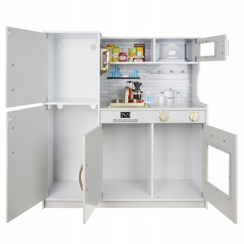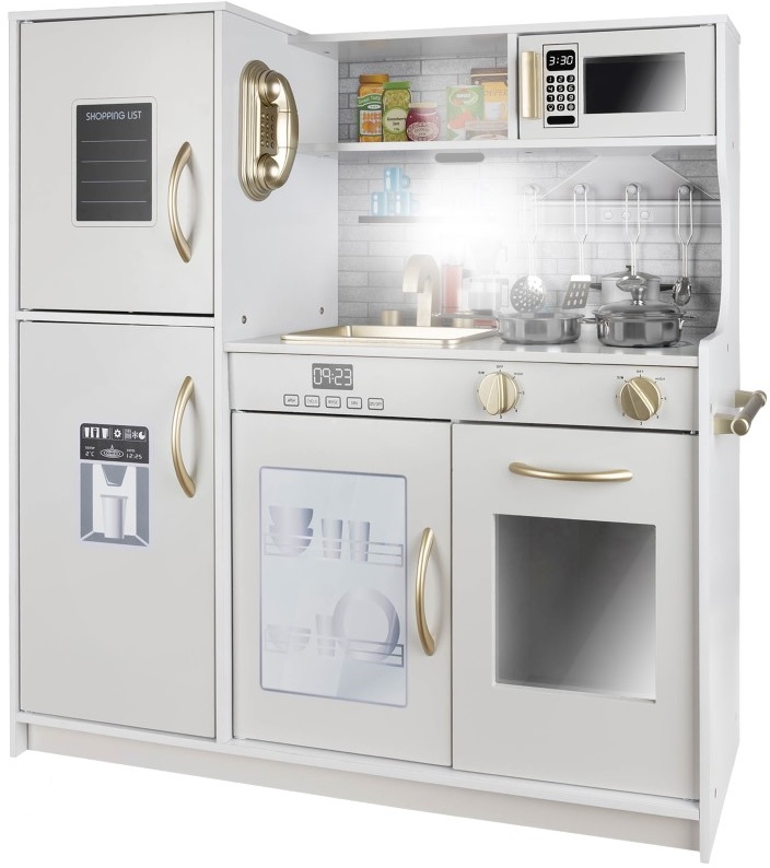 Към кухнята има LED лампа, която може да се постави под шкафа, в шкафа или във фурната – изборът е ваш! Осветлението ще накара детето да се почувства като в истинска кухня, като ефектът ще е още по-голям, когато стаята е тъмна, а лампата ще позволи на детето да приготви вечеря за куклите, мечето или родителите си. Освен това, котлоните издават щракащ звук, когато завъртите копчетата! Вашето дете ще бъде във възторг – кухнята ще позволи много часове забавление.