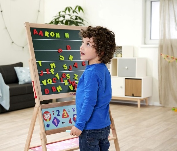 Децата могат да пишат и рисуват върху двустранната дъската с тебешир или да изписват кратки думи с включените магнитните букви. Дъската разполага с практично отделение за съхранение на аксесоари като 10-те тебешира, гъбата и 48-те магнитни букви, включени в комплекта.