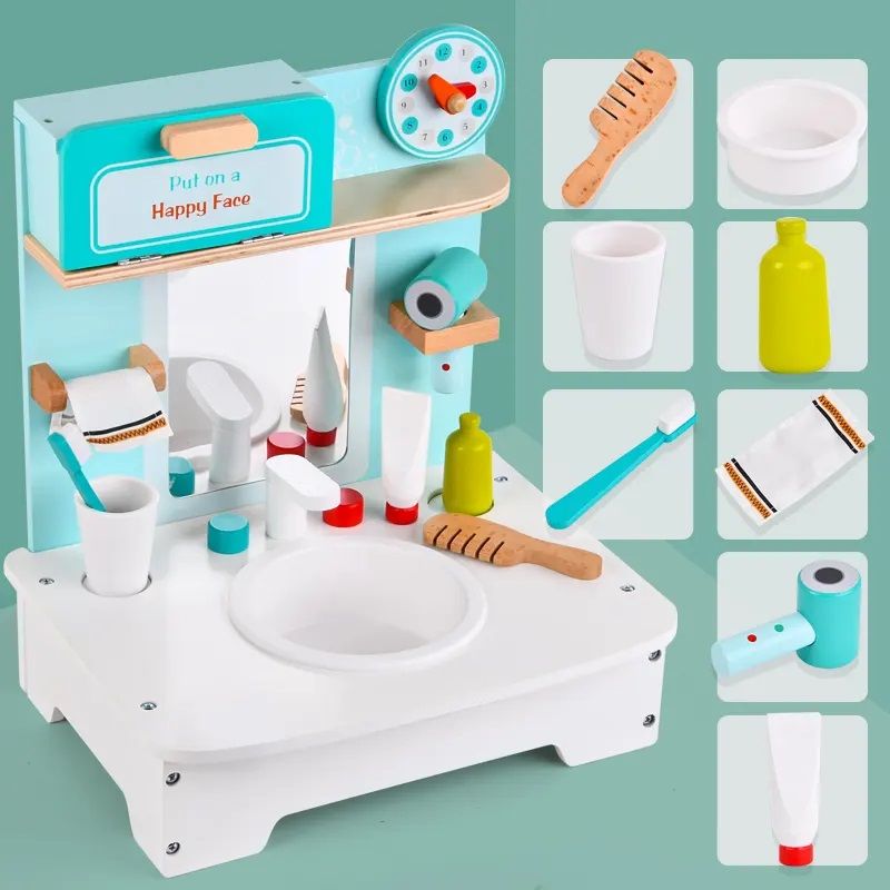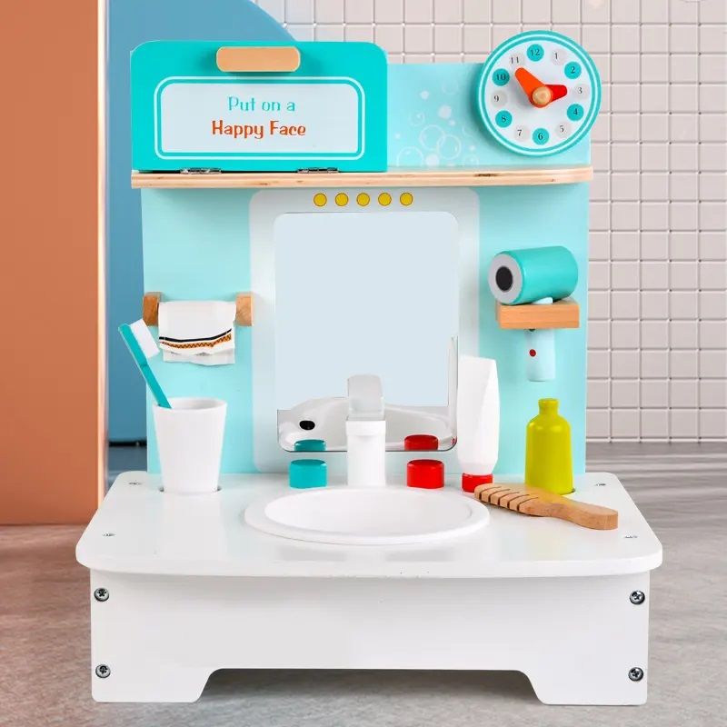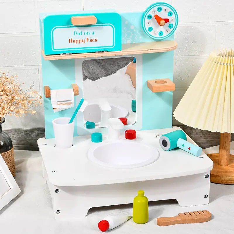 Детска дървена мивка с огледало, шкаф и различни принадлежности за баня, като – сешоар, четка за зъби с чашка, паста за зъби, гребен, кърпа за ръце, с които децата ще могат да придобият важни хигиенни навици, докато играят.