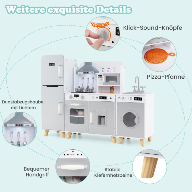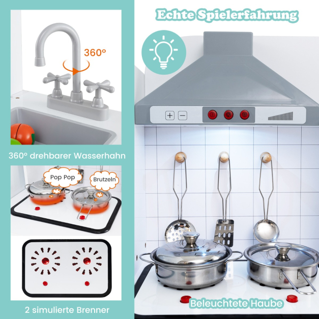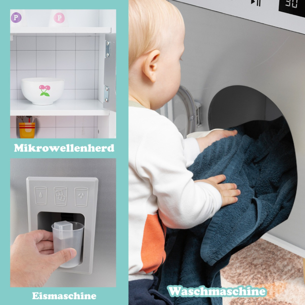 Тази невероятна и просторна кухня за игра разполага с хладилник, кухненски комплект и пералня с мивка. Всяка част е проектирана самостоятелно и може да бъде креативно комбинирана от най-малките. В допълнение, тази детска кухня има реалистични функции като кран, въртящ се на 360°, котлони, осветен аспиратор, микровълнова печка и ледогенератор, осигурявайки цялостно и вълнуващо готварско изживяване.