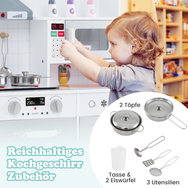Кухненският комплект за игра включва и разнообразие от готварски съдове като 3 прибора, 2 тенджери, чаша и 3 кубчета лед за безкрайно кулинарно творчество. Тази кухня за игра насърчава важни умения като координация око-ръка, креативност и социално взаимодействие и е идеалният подарък за деца на 3 и повече години.