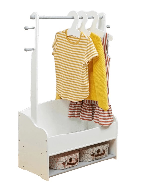 Дървена и практична стойка за дрехи, която чудесно ще пасне в детската стая на децата ви. Върху нея могат да се наредят закачалки за ризи, сака, рокли, блузки и пуловери, а отстрани има 4 стабилни куки за якета, шалове и шапки.
