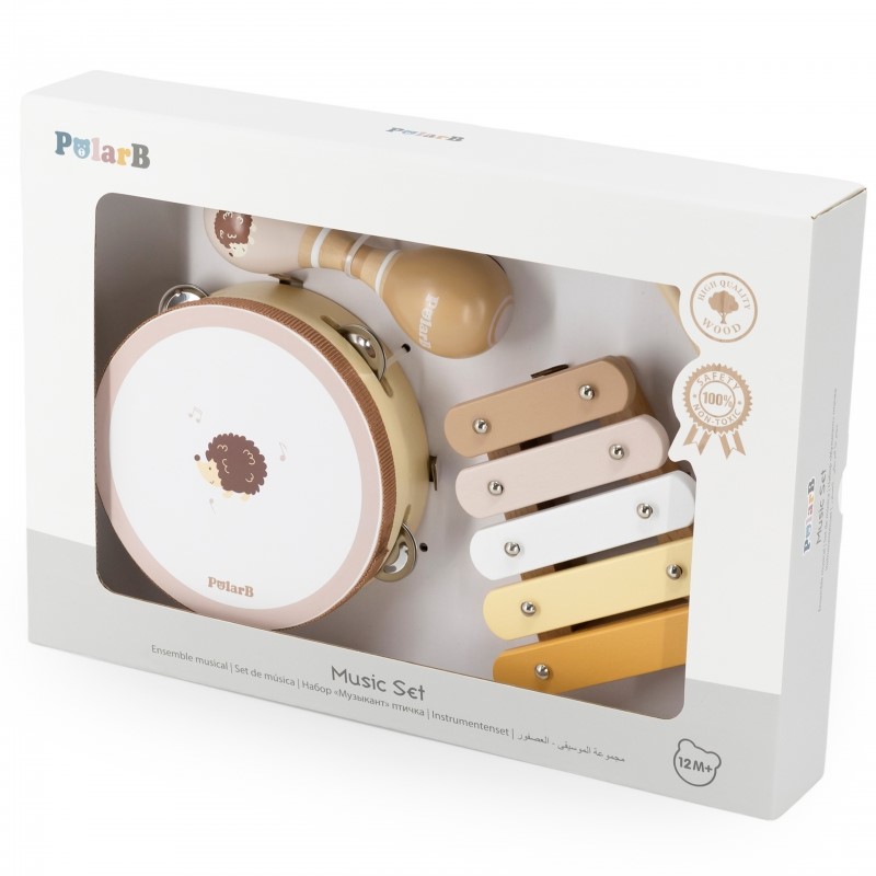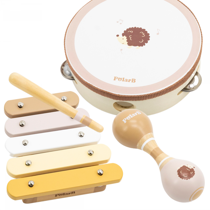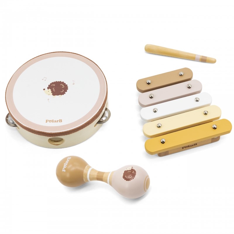 Ксилофонът ще зарадва децата с реалните си звуци, които издава и е идеален инструмент, които подобрява координацията между ръцете и очите, сръчността и творческите умения. Тамбурата и маракасите са изрисувани с малки таралежи и могат да се използват още от ранна възраст.