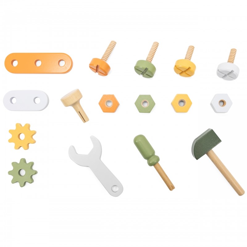 Куфарче с инструменти съдържа всичко необходимо – чук, гаечен ключ, отвертка, болтове, гайки, дървени летвички и плоскости за сглобяване. Лесно може да се обърне куфарчето и да се превърне в маса за игра. Може да покажете как се забиват дървени гвоздеи в отворите. Или да сглобява дървените летвички с болтове и гайки, като използва отвертка и гаечен ключ.