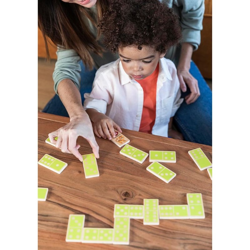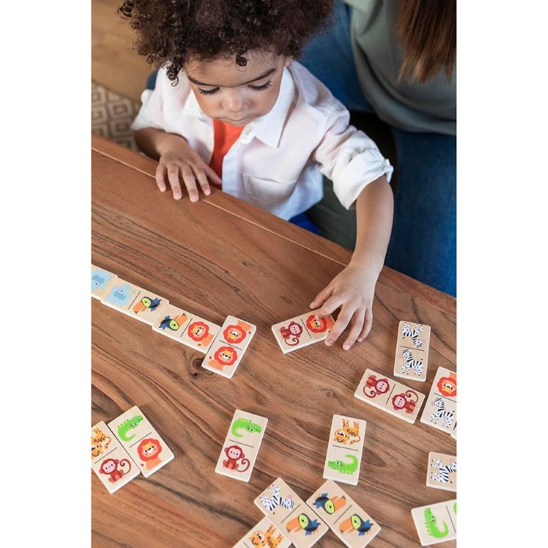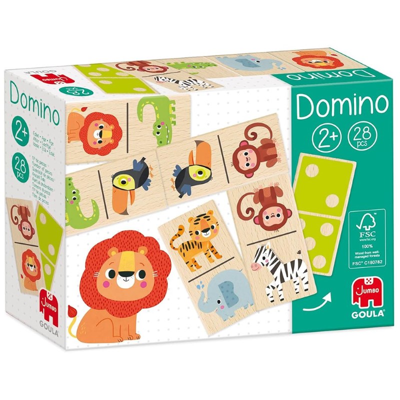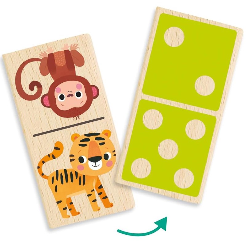 Цветното домино е с две лица като от едната страна, то е изрисувано с различни животни от джунглата, а от другата е с точици, съответстващи на числата, като провокира децата да усвоят с лекота и това знание за смятане. Доминото е образователна игра която ще подпомогне развитието на визуалната памет, фината моторика, координацията, концентрацията и паметта.