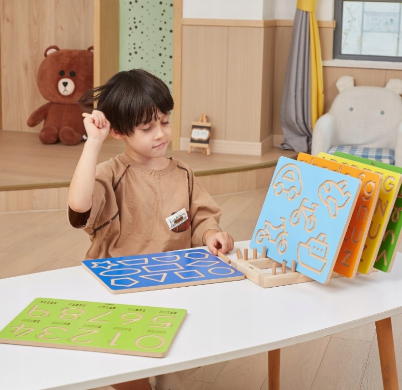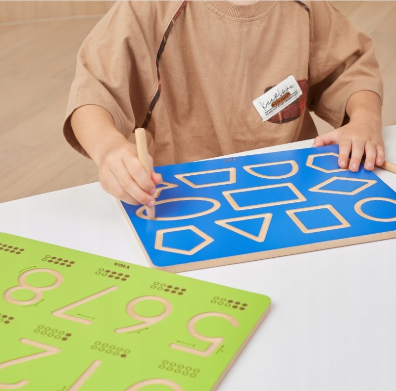 Дъска за изписване на геометрични фигури от VIGA, която е идеален вариант за децата да тренират ръцете си преди да се научат да пишат. Деликатно гравираните и извити улеи я правят идеална за децата да контролират движението на ръцете си и да изградят мускулна памет чрез многократно проследяване.