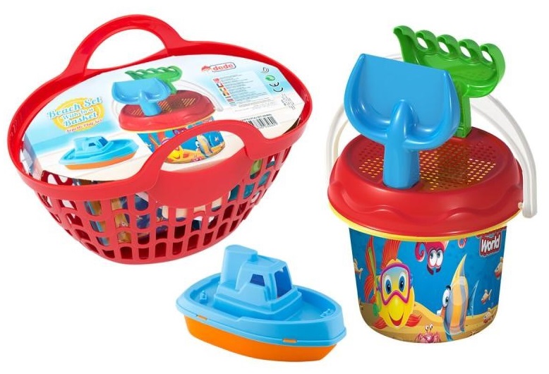 Детски комплект за игра в пясъка, съдържащ кофичка, сито, лопата, гребло и корабче и всички те прилежно са събрани в удобна за носене кошничка. Изработени са от висококачествен и здрав материал. Играта в пясъка и изграждането на различни фигури ще осигури на децата много часове на забавления. Тези играчки отлично поддържат креативността, въображението и концентрацията на децата.