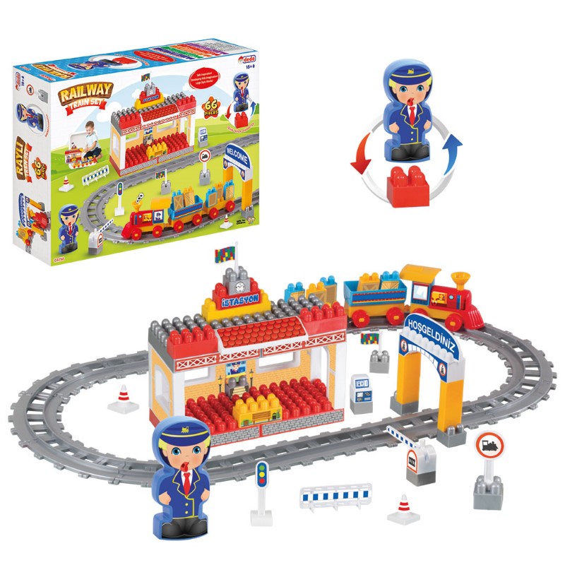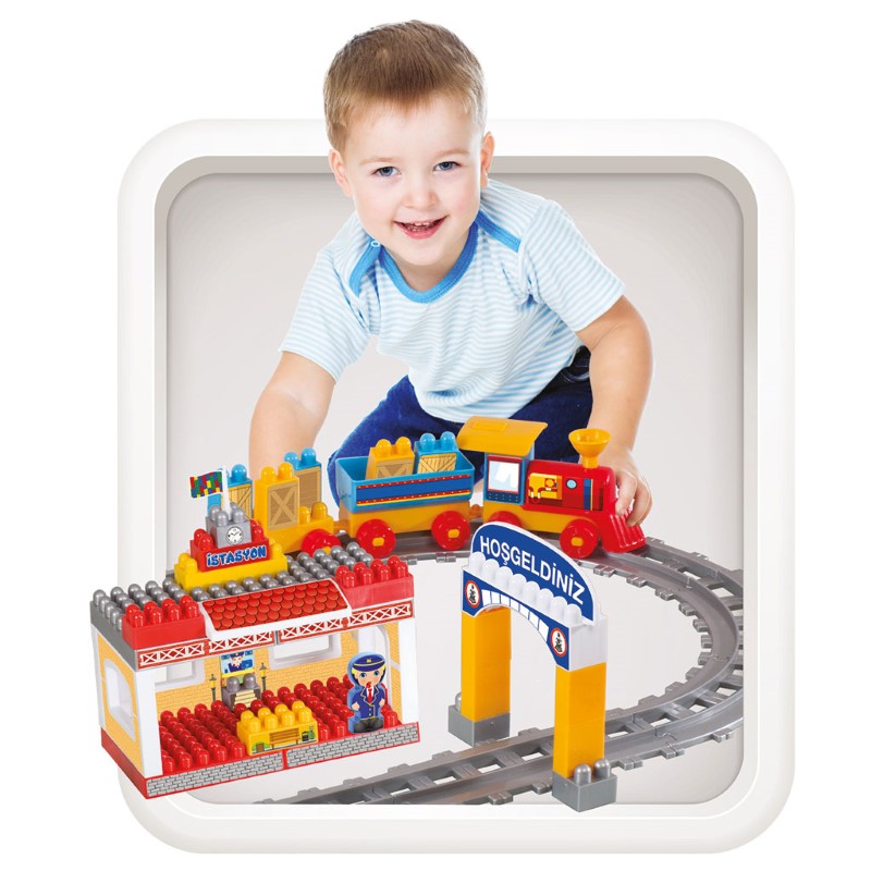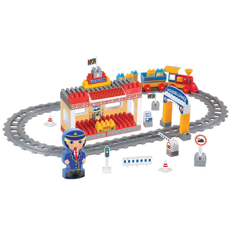 Детски конструктор с едри части, с които децата могат да си сглобят малка ЖП гара и релси, по които се движи цветно влакче с два вагона. Частите са цветни, с различни форми и позволяват неограничени забавления. Многобройните игри с конструктора развиват координацията на ръце-очи. Частите се съхраняват в удобната кутия, в която ще го получите. Конструкторът съдържа 65 елемента.