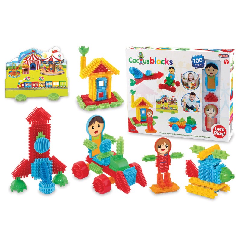 Детски конструктор съдържащ 100 цветни елементи с бодлички, с които децата ще могат да си правят различни фигури, превозни средства и сгради.