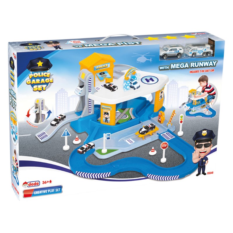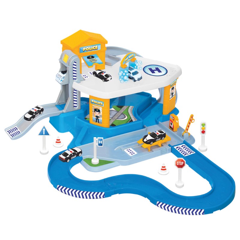 Постройте си вашият мечтан двуетажен полицейски участък, които разполага паркинг с дълга писта, автомивка, колонка за зареждане на гориво и множество аксесоари. В комплекта са включени и 2 метални колички.