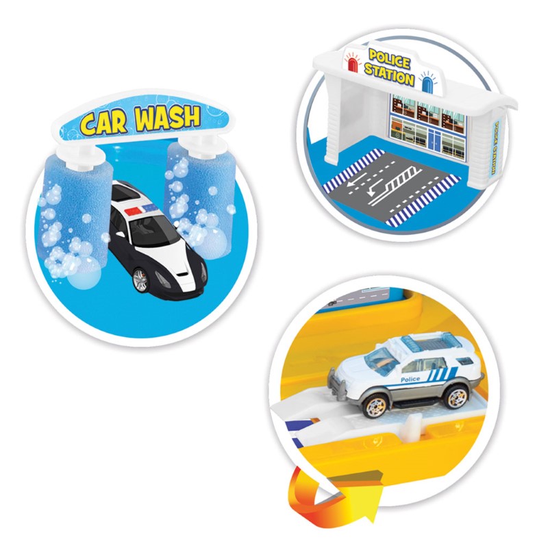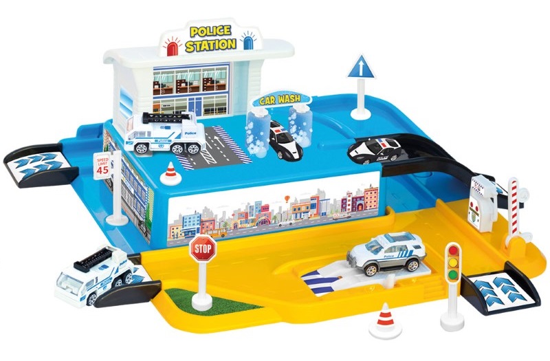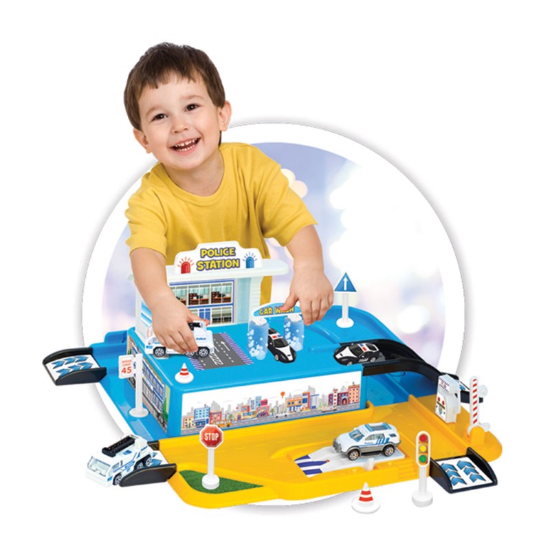 Детски игрален комплект, който ще допринесе за доброто настроение на децата. Комбинирайте парчетата от комплекта и си постройте мечтаното от вас полицейско управление с рампа и започнете играта сами или с вашите приятели. Управлението разполага и с гараж, автомивка, колонка за гориво и множество аксесоари. В комплекта са включени и 2 метални колички.