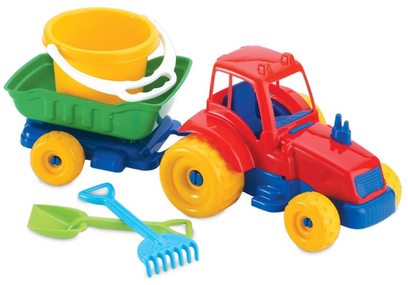 Детски трактор с ремарке и комплект за пясък включващ кофичка, лопатка и гребло.
