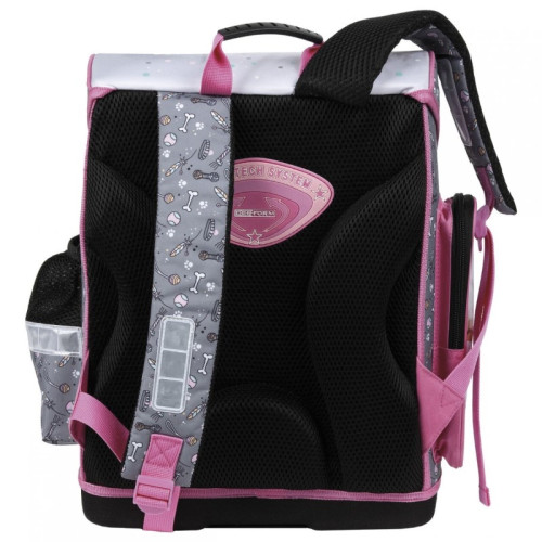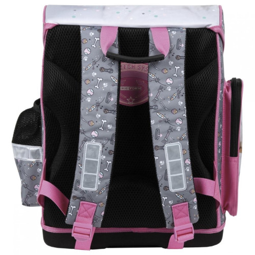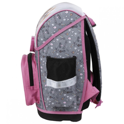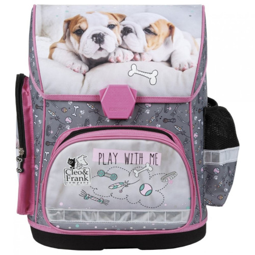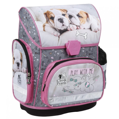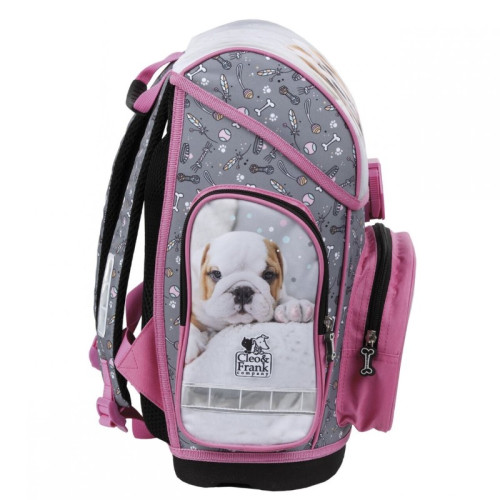 Ученическа раница със сладки кученца от серията Cleo&Frank на Derform, с лека и удобна за носене конструкция, ергономичен гръб от специална дишаща материя идеална за деца от началното училище. Раницата е изработена от висококачествени и водоустойчиви материали. Основното отделение е голямо, разделено на три с вътрешни прегради.