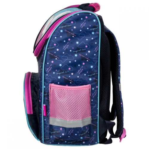 Тази приказна раница ще бъде чудесен спътник за вашето момиченце в училище и извън него. Подходяща е за деца от началното училище. Раницата е лека и издръжлива, изработена от висококачествени и водоустойчиви материали. Основното отделение е голямо и теглото на учебниците и тетрадките равномерно се разпределя. Капакът на раницата се затваря с двупосочен цип с гумени накрайници. Раницата разполага с два странични джоба – един с цип и един с мрежа, голям преден джоб за по-дребни аксесоари. Дъното е твърдо, водоустойчиво. Гърбът е твърд, ергономичен, покрит с дишаща материя. Презрамките са меко подплатени и покрити с дишаща материя – регулируеми. Върху раницата има разположени отразители, което гарантира безопасността на пътя.