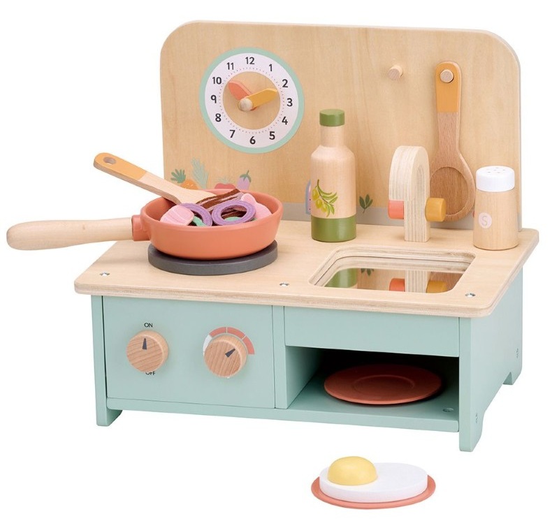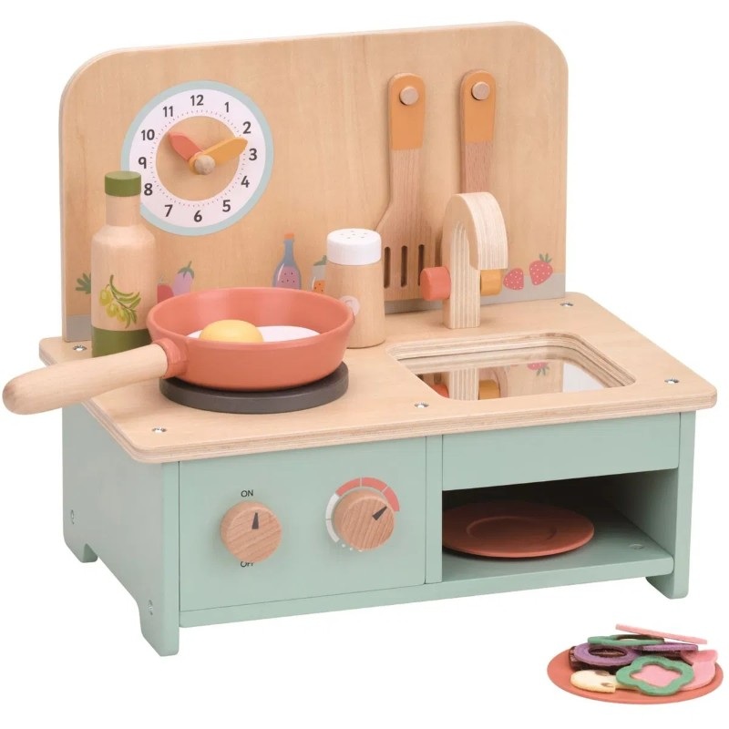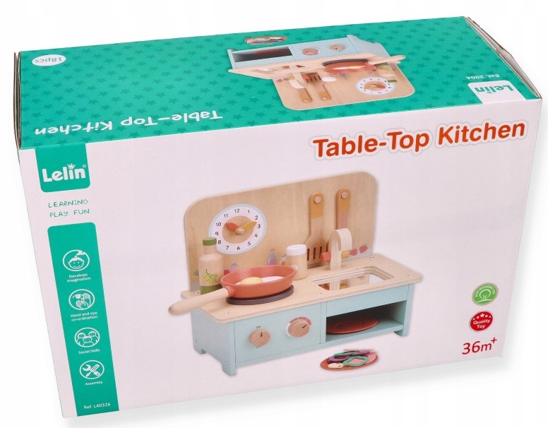 Дървена настолна кухня, която предлага голямо забавление от ролеви игри. Кухнята е със здрава дървесина, реалистични аксесоари и детайли и кани децата да приготвят вкусни ястия. Независимо дали сами или с приятели, този комплект осигурява творческо време за игра в техния собствен малък кухненски свят.